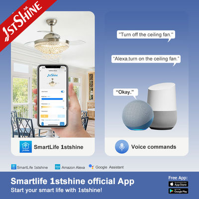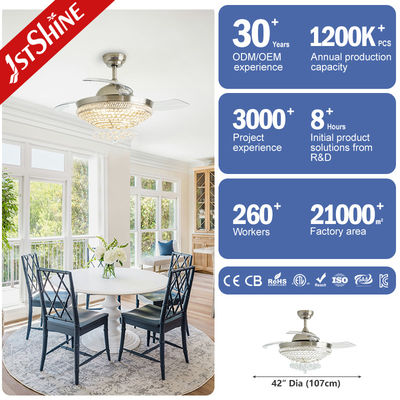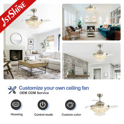 2. Kristallenverlichting: Wanneer het licht wordt ingeschakeld, schijnt de helderheid van de intrekbare plafondventilator echt door.Het licht dat door het kristal onder de lampenscherm gaat, wordt gebroken tot een prachtige en boeiende verlichting, die een betoverende gloed werpt die de kamer betovert.